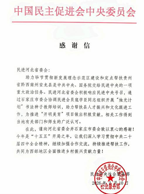 信中指出,助力毕节贯彻新发展理念示范区建设和定点帮扶贵州省黔西南州安龙县是中共中央、国务院交给民进中央的一项重大政治任务。民进河北省委会通过石家庄市委会协调民进会员寇学臣同志组织开展“烛光计划”书法种子教师培训,助力帮扶县人才振兴和文化跟进工作,为推进“开明美育”项目作出积极贡献,相关工作得到当地有关部门和师生的广泛认可。